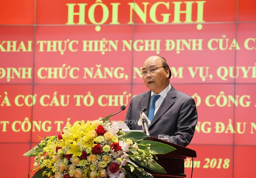 Tại Hội nghị, thừa ủy quyền Thủ tướng Chính phủ, đồng chí Mai Tiến Dũng, Bộ trưởng, Chủ nhiệm Văn phòng Chính phủ đã công bố Nghị định số 01/NĐ-CP, ngày 06/8/2018 của Chính phủ quy định chức năng, nhiệm vụ, quyền hạn và cơ cấu tổ chức của Bộ Công an... Theo đó, chức năng, nhiệm vụ, quyền hạn của Bộ Công an cơ bản không thay đổi, tổ chức bộ máy Bộ Công an được xây dựng tập trung, thống nhất, chuyên sâu theo hướng “Bộ tinh, tỉnh mạnh, huyện toàn diện, xã bám cơ sở”, làm cơ sở cho việc điều chỉnh, bố trí lực lượng và thực hiện tinh giản biên chế; tập trung đầu tư cho đơn vị trực tiếp chiến đấu, hướng về cơ sở... Nghị định cũng nêu rõ, tổ chức bộ máy của cơ quan Bộ Công an gồm các đơn vị cấp Cục, so với bộ máy tổ chức cũ giảm 06 Tổng cục, giảm gần 60 đơn vị cấp Cục và gần 300 đơn vị cấp Phòng. Ở Công an địa phương sáp nhập 20 Cảnh sát phòng cháy, chữa cháy vào Công an tỉnh, thành phố và tinh gọn tổ chức Công an cấp tỉnh, cấp huyện, giảm hơn 500 đơn vị cấp Phòng, gần 1.000 đơn vị cấp Đội...