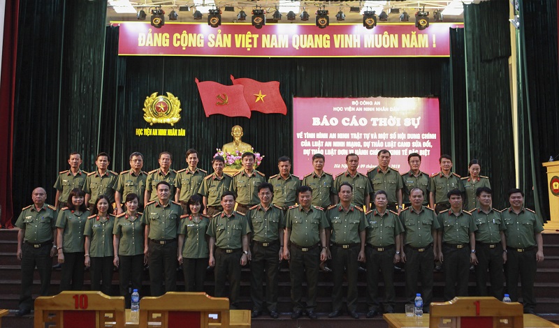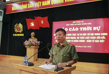 Thực hiện ý kiến chỉ đạo của Đảng ủy Công an trung ương, lãnh đạo Bộ Công an, chiều 9/8, tại Hà Nội, Học viện An ninh nhân dân (ANND) tổ chức buổi báo cáo thời sự về “Tình hình an ninh, trật tự trong nước thời gian qua và một số nội dung chính của Luật An ninh mạng vừa được Quốc hội khóa XIV thông qua, dự thảo Luật Đơn vị hành chính - kinh tế đặc biệt, dự thảo Luật CAND sửa đổi” cho toàn thể lãnh đạo, cán bộ, giảng viên, công nhân viên Học viện. Thiếu tướng, GS.TS Lê Minh Hùng - Phó Bí thư Đảng ủy, Phó Giám đốc Học viện chủ trì hội nghị; tham dự có các đồng chí trong Đảng ủy, Ban Giám đốc Học viện, lãnh đạo các đơn vị thuộc Học viện, Viện Khoa học an ninh và toàn thể cán bộ, giảng viên, công nhân viên Học viện.