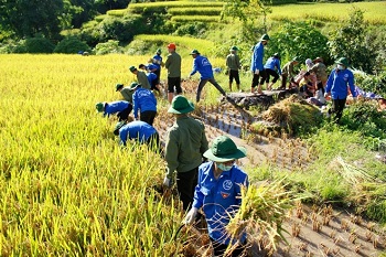 Sinh viên tình nguyện C500 giúp đỡ bà con thu hoạch vụ mùa. |