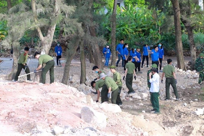 Học viên Học viện ANND tham gia làm công trình thanh niên đường bê tông dẫn ra biển tại