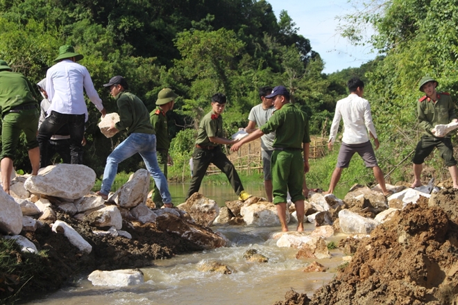 Sinh viên Học viện ANND với Công an tỉnh và chính quyền địa phương xây dựng cầu tạm tại xã Bắc Sơn, huyện Quỳ Hợp, tỉnh Nghệ An.