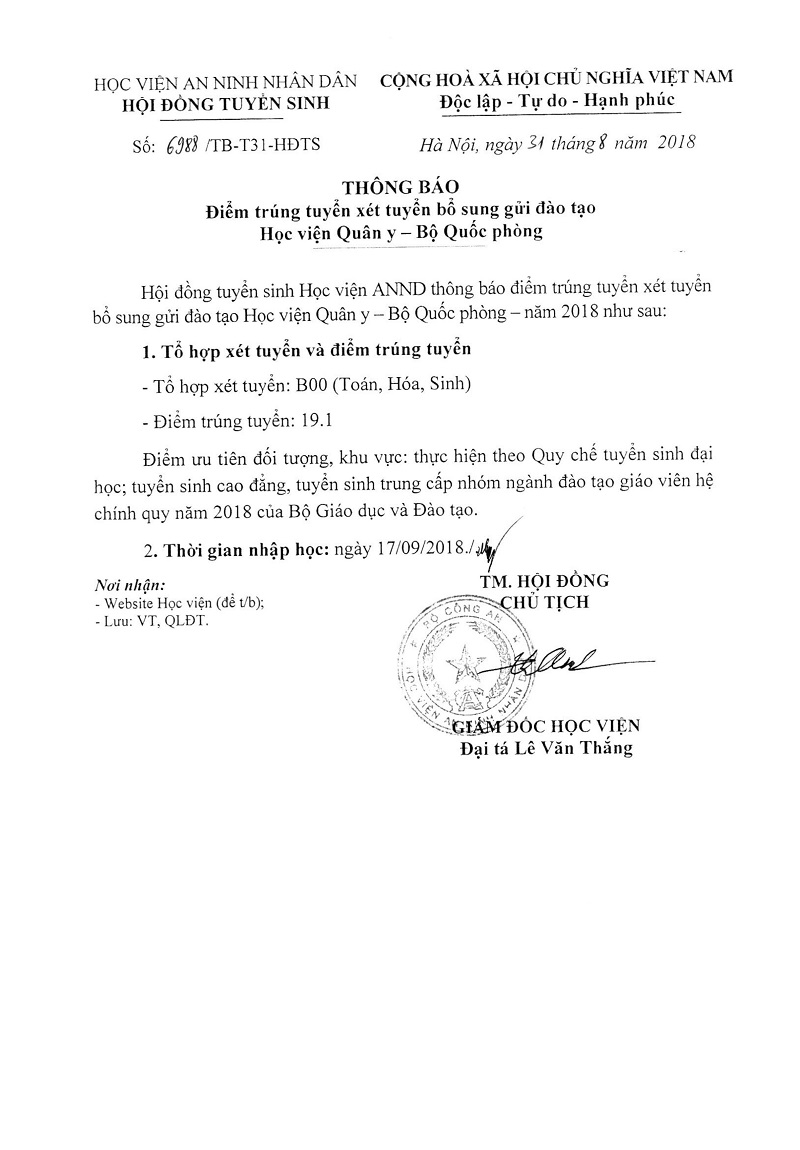 Hội đồng tuyển sinh Học viện An ninh nhân dân thông báo điểm trúng tuyển xét tuyển bổ sung gửi đào tạo Học viện Quân y – Bộ Quốc phòng – năm 2018 như sau: