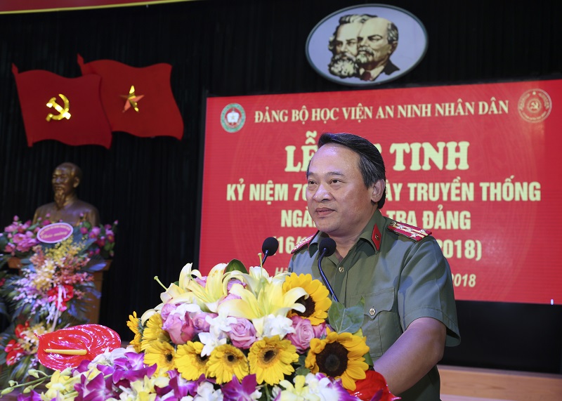 Phát biểu tại Lễ mít tinh, Đại tá Tạ Quang Huy - Ủy viên chuyên trách Ủy ban kiểm tra Đảng ủy Công an Trung ương và Thiếu tướng, PGS.TS Lê Văn Thắng - Bí thư Đảng ủy, Giám đốc Học viện ghi nhận, biểu dương những thành tích, đóng góp quan trọng của ủy ban kiểm tra các cấp và đội ngũ cán bộ kiểm tra qua các thời kỳ vào thành tích chung của Đảng bộ Học viện ANND anh hùng. Đồng chí Bí thư Đảng ủy, Giám đốc Học viện khẳng định: Từ khi thành lập đến nay, ủy ban kiểm tra các cấp trong Đảng bộ Học viện đã chủ động tham mưu giúp cấp ủy lãnh đạo, chỉ đạo, tổ chức thực hiện có hiệu quả nhiệm vụ kiểm tra, giám sát; góp phần nâng cao năng lực lãnh đạo, sức chiến đấu của tổ chức đảng và đảng viên; giữ vững kỷ luật, kỷ cương, tăng cường đoàn kết, thống nhất trong Đảng; ngăn chặn, đẩy lùi sự suy thoái về tư tưởng chính trị, đạo đức, lối sống, những biểu hiện “tự diễn biến”, “tự chuyển hóa” trong nội bộ, xây dựng Đảng bộ Học viện trong sạch, vững mạnh. Đồng chí Bí thư Đảng ủy, Giám đốc Học viện chỉ đạo, trong tình hình mới, trước những yêu cầu của công tác xây dựng và chỉnh đốn Đảng, nhiệm vụ của ủy ban kiểm tra các cấp và đội ngũ cán bộ làm công tác kiểm tra trong Đảng bộ Học viện sẽ rất nặng nề, đòi hỏi cần tiếp tục nỗ lực phấn đấu không ngừng, hoàn thành xuất sắc nhiệm vụ được giao, xứng đáng với vinh dự và trách nhiệm của người cán bộ kiểm tra của Đảng.