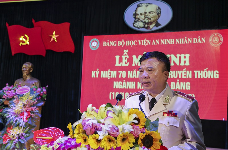 Thiếu tướng, GS.TS Lê Minh Hùng - Phó Bí thư Đảng ủy, Phó Giám đốc Học viện, Chủ nhiệm Ủy ban kiểm tra Đảng ủy Học viện phát biểu ôn lại truyền thống 70 năm phát triển và trưởng thành của Ngành Kiểm tra Đảng và quá trình xây dựng, phát triển của Đảng ủy Học viện. Đồng chí nhấn mạnh, qua các thời kỳ cách mạng, kể cả những thời điểm cam go ác liệt nhất, đội ngũ cán bộ làm công tác kiểm tra luôn tuyệt đối trung thành với Đảng, có bản lĩnh chính trị vững vàng, chấp hành nghiêm chủ trương, đường lối, chính sách, nghị quyết, chỉ thị của Đảng, khắc phục khó khăn, phấn đấu hoàn thành xuất sắc nhiệm vụ được giao, xây đắp nên truyền thống vẻ vang của Ngành Kiểm tra Đảng “Tuyệt đối trung thành, đoàn kết, trung thực, liêm khiết, kỷ cương và tận tụy”… Cùng với lịch sử vẻ vang của Ngành Kiểm tra Đảng nói chung, ủy ban kiểm tra các cấp và các thế hệ cán bộ làm công tác kiểm tra trong Đảng bộ Học viện luôn giữ vững phẩm chất chính trị, đạo đức cách mạng, nỗ lực phấn đấu hoàn thành xuất sắc nhiệm vụ được giao, đóng góp tích cực vào thành tích 72 năm xây dựng và phát triển của Đảng bộ Học viện ANND anh hùng, góp phần tô thắm thêm truyền thống 70 năm xây dựng và trưởng thành của Ngành kiểm tra Đảng nói chung và ủy ban kiểm tra các cấp trong Đảng bộ Công an Trung ương nói riêng.