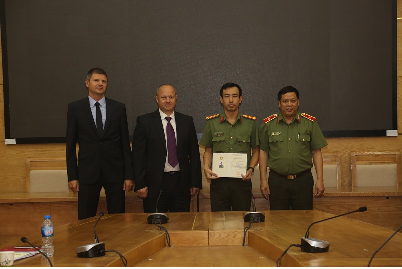 Thiếu tướng, PGS.TS Lê Văn Thắng - Giám đốc Học viện, cùng chuyên gia Cơ quan An ninh Liên bang Nga trao chứng chỉ cho Học viên