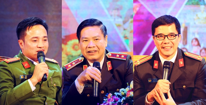 Trung tá Mai Hoàng, Trưởng Công an huyện Mộc Châu và Trung tướng Nguyễn Xuân Mười, nguyên Phó Tổng cục trưởng Tổng cục Chính trị CAND cùng Trung tá Nguyễn Hồng Phong, Phó Cục trưởng Cục An ninh nội địa giao lưu trong chương trình.