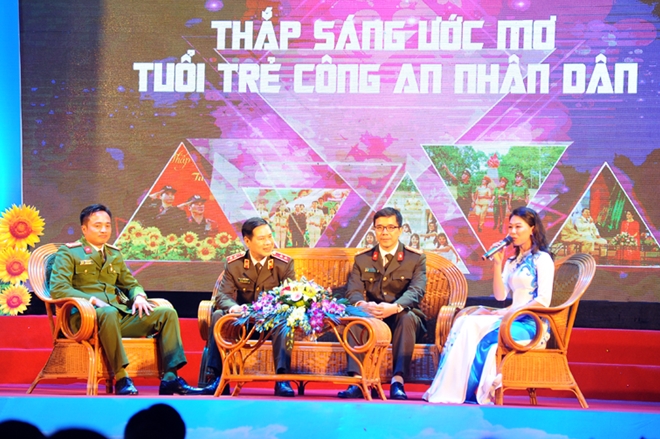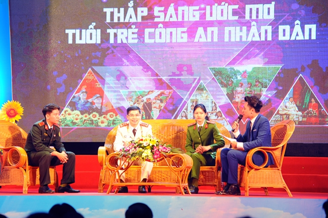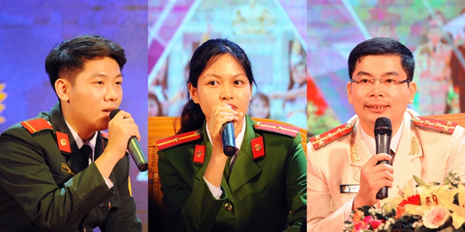 Hạ sỹ Hà Quang Trường, Bộ Tư lệnh Cảnh vệ, Bộ Công an và Thiếu úy Lê Thị Thùy Linh, Thủ khoa vừa tốt nghiệp Học viện CSND cùng Thiếu tá Cao Ngọc Anh, gương nhà giáo trẻ tiêu biểu của Học viện ANND giao lưu trong chương trình.