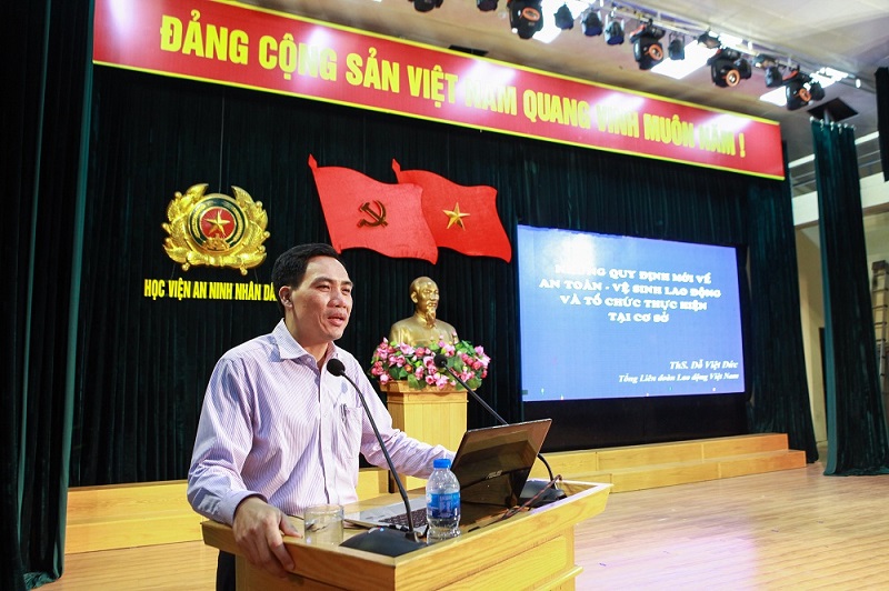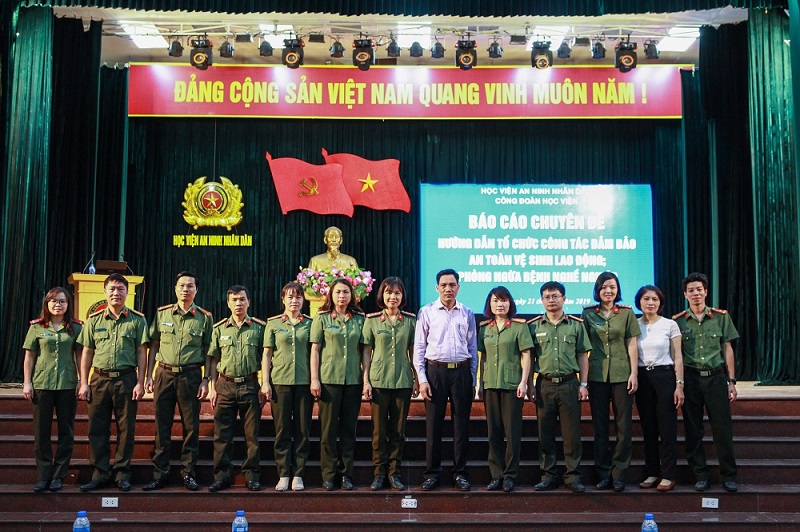 Thực hiện Kế hoạch về việc tổ chức Tháng Công nhân và Tháng hành động về An toàn vệ sinh lao động trong Học viện ANND, sáng 21/5, tại Học viện ANND, Công đoàn Học viện đã tổ chức buổi báo cáo chuyên đề “Hướng dẫn tổ chức công tác đảm bảo An toàn vệ sinh lao động, phòng ngừa bệnh nghề nghiệp”.
