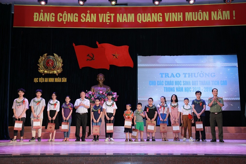 Thay mặt Đảng ủy, Ban Giám đốc Học viện, đồng chí Thiếu tướng, GS.TS Lê Minh Hùng và đồng chí Thượng tá Nguyễn Hữu Anh - Trưởng phòng CTĐ, CTCT & CTQC đã trao thưởng cho các em học sinh đạt thành tích xuất sắc trong năm học vừa qua. Tổng kết năm học 2018 - 2019, có 01 em đạt học sinh giỏi cấp Quốc gia; 03 em đạt học sinh giỏi cấp Thành phố; 13 em đạt học sinh giỏi cấp Quận và nhiều em nhỏ đạt các giải VHVN - TDTT...