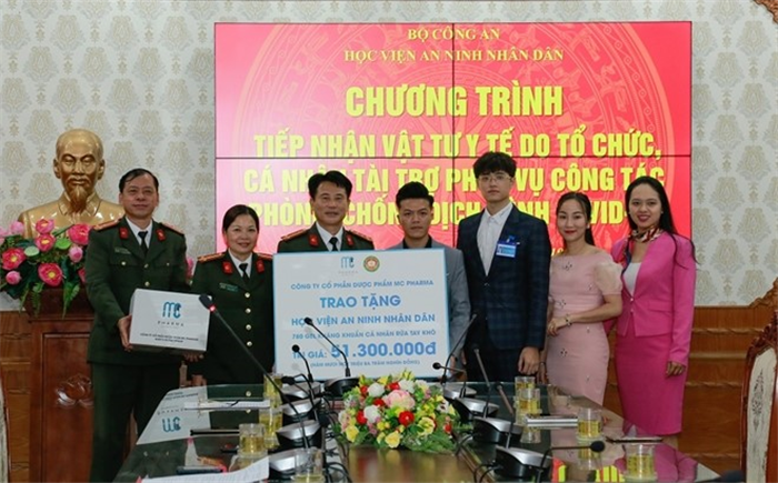 Trong chương trình, đại diện Công ty cổ phần dược phẩm MC Pharma đã kịp thời hỗ trợ gần 800 chai dung dịch sát khuẩn, trị giá hơn 50 triệu đồng cho Học viện ANND để cùng chung tay thực hiện công tác phòng, chống dịch bệnh COVID-19.
