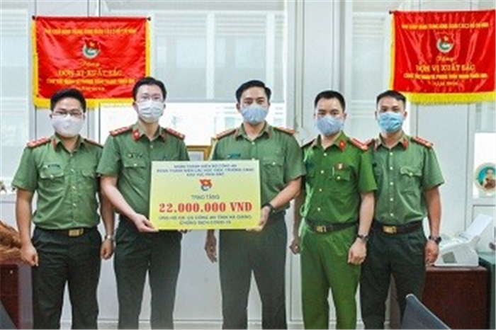 Đoàn Thanh niên khối các Học viện, trường CAND khu vực phía Bắc đã trao tặng số tiền 22 triệu đồng cho chương trình Chung tay ủng hộ cán bộ, chiến sĩ Công an tỉnh Hà Giang trong công tác phòng, chống dịch COVID-19 thông qua đơn vị chủ trì là Đoàn Thanh niên Bộ Công an.