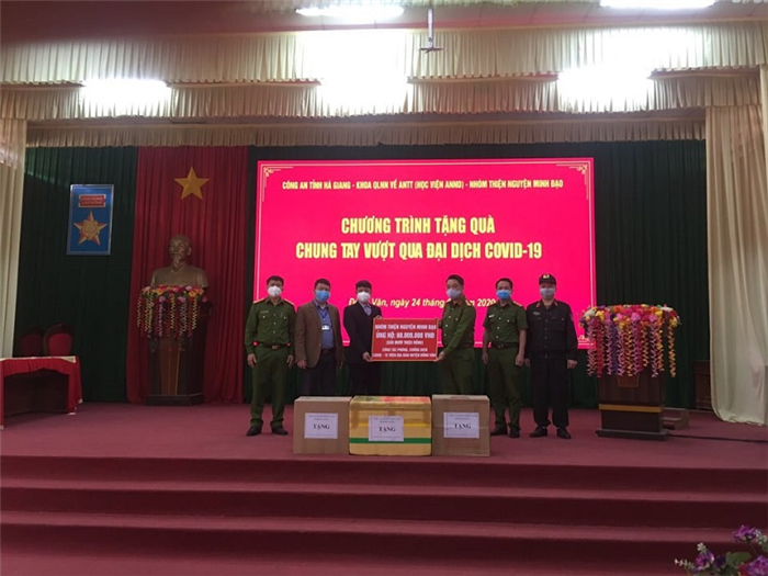 Ngày 24/4/2020 Khoa Quản lý nhà nước về an ninh trật tự và nhóm thiện nguyện Minh Đạo đã tiếp tục phối hợp với Công an tỉnh Hà Giang tặng quà, nhu yếu phẩm cho người dân tại huyện Đồng Văn và các đơn vị trực tiếp tham gia phòng chống dịch tại tỉnh Hà Giang với tổng giá trị 60.000.000 đồng