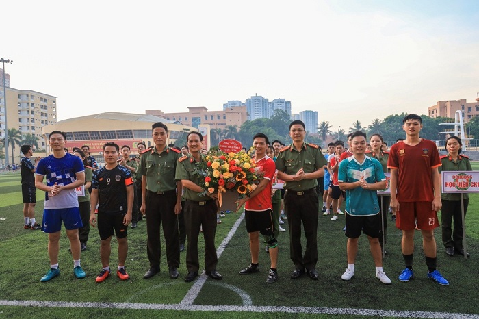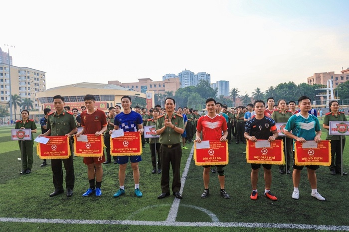 Thượng tá Nguyễn Hữu Anh - Bí thư Đảng ủy, Trưởng Phòng QLHV trao giải cho các đội bóng