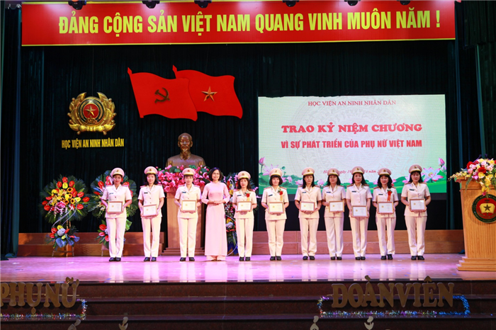 Đồng chí Nguyễn Thị Quế - Phó Chủ tịch Hội Phụ nữ Bộ Công an trao kỷ niệm chương “Vì sự phát triển của phụ nữ Việt Nam” cho các nữ cán bộ, giảng viên Học viện