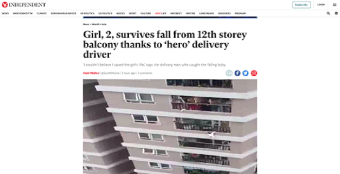 * Tờ Independent của Anh mới đây đã đưa tin về "người hùng" Nguyễn Ngọc Mạnh sau khi anh dũng cảm cứu sống một bé gái 3 tuổi rơi từ tầng 12A toà nhà chung cư.