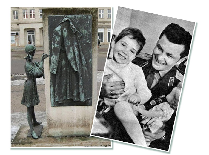 Đại úy Igor Belikov cùng bé gái Kathrin Lehmann (ảnh trái). Phù điêu chiếc áo khoác sĩ quan và tượng cô bé Kathrin Lehmann tại đài kỷ niệm sự kiện này ở thành phố Magdeburg (ảnh phải)