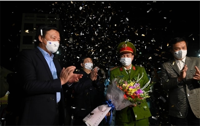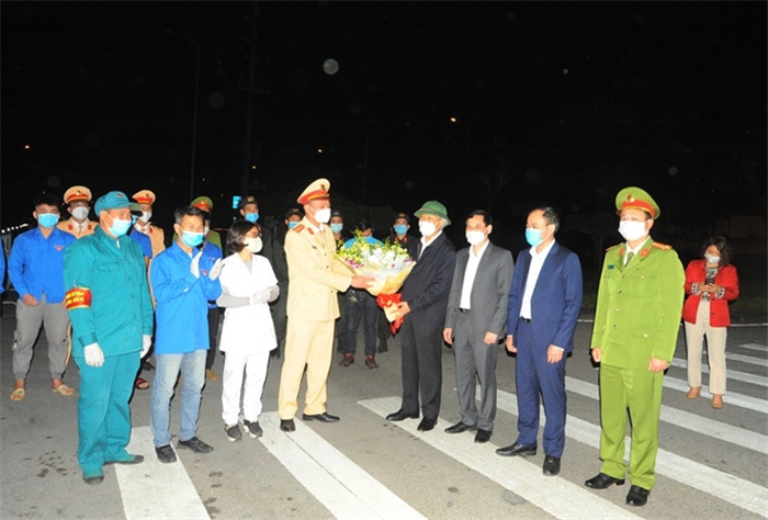 Đồng chí Bí thư Tỉnh ủy Hải Dương tặng hoa chúc mừng lực lượng làm nhiệm vụ trực chốt kiểm soát dịch bệnh tại khu vực Quảng trường Sao Đỏ (thành phố Chí Linh).