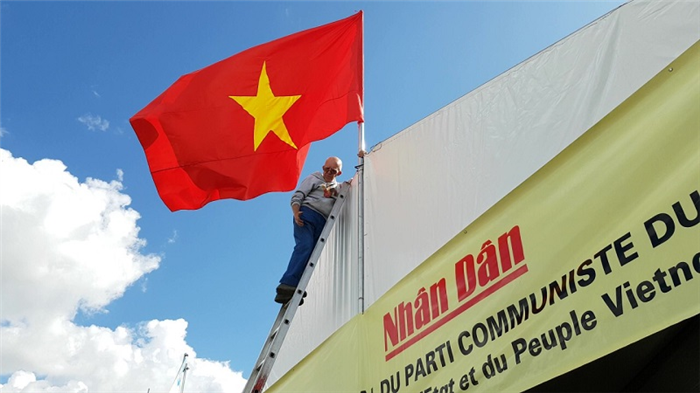 Cờ đỏ sao vàng tung bay trên Gian trưng bày Báo Nhân Dân tại Hội báo Nhân đạo. Mỗi dịp đến hội báo, Việt kiều và bạn bè Pháp lại đến giúp Báo Nhân Dân tổ chức các hoạt động giới thiệu về Việt Nam.