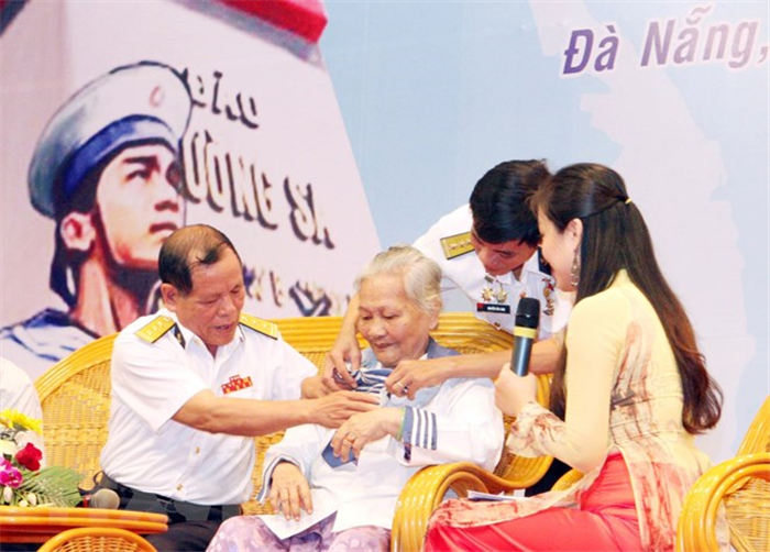 Bà Lê Thị Muộn, mẹ của Liệt sỹ Phan Văn Sự, người đã hy sinh anh dũng trong trận chiến bảo vệ chủ quyền biển đảo Tổ quốc ở Gạc Ma năm 1988, mặc chiếc áo - kỷ vật duy nhất còn lại của người con trai, tại chương trình giao lưu Hướng về Trường Sa thân yêu, ngày 14/3/2013.
