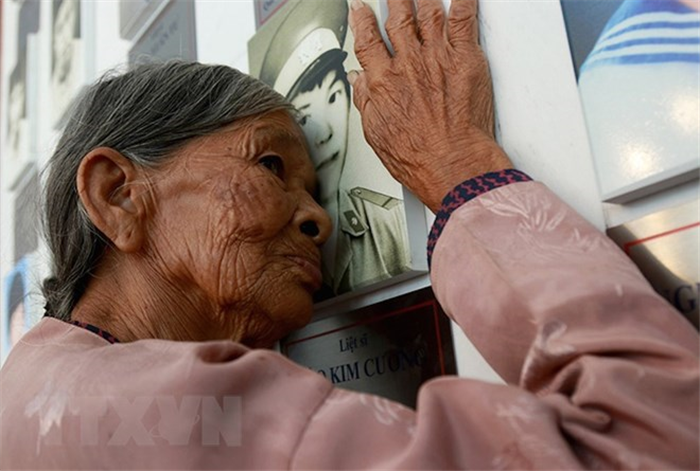 Bà Hà Thị Liên (quê ở huyện Can Lộc, tỉnh Hà Tĩnh), mẹ liệt sỹ Đào Kim Cương, trước di ảnh con trai ở khu lưu niệm di vật liệt sỹ Gạc Ma trong Khu tưởng niệm chiến sỹ Gạc Ma (Khánh Hòa).