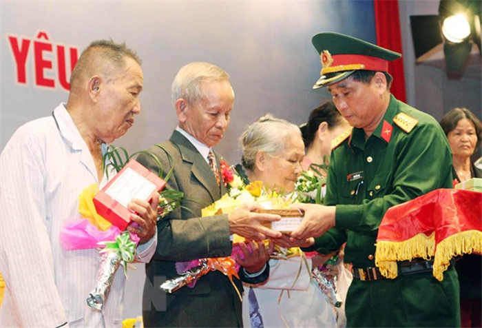Đại diện Quỹ Tấm lòng Vàng (Báo Lao Động) trao tiền hỗ trợ cho vợ chồng ông Võ Ta và bà Phan Thị Đay (xã Ninh Ích, thị xã Ninh Hòa, tỉnh Khánh Hòa), là bố mẹ của liệt sỹ Võ Đình Tuấn hy sinh trong trận chiến đấu bảo vệ chủ quyền biển đảo Tổ quốc ở Gạc Ma năm 1988.