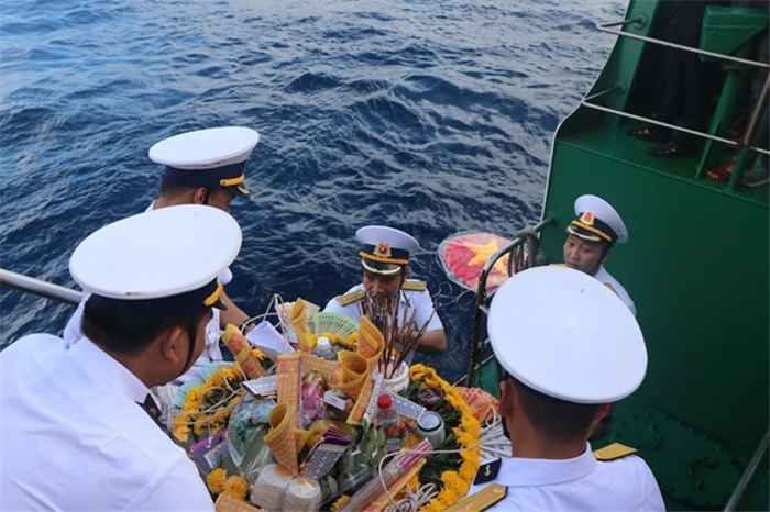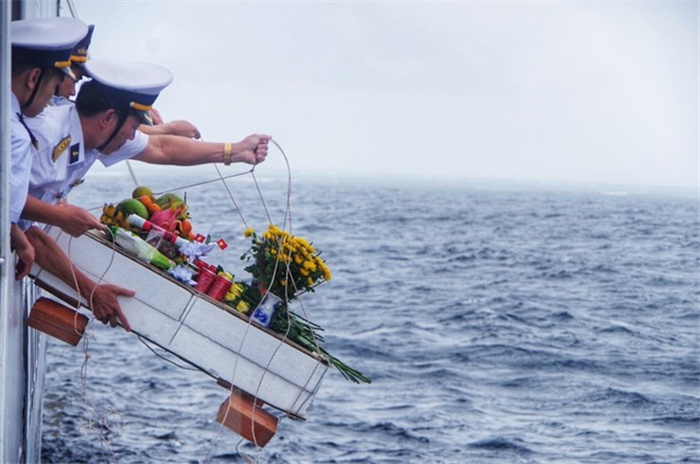 Thả vòng hoa xuống biển tưởng niệm các liệt sỹ đã anh dũng hy sinh bảo vệ chủ quyền biển đảo Tổ quốc tại quần đảo Trường Sa.