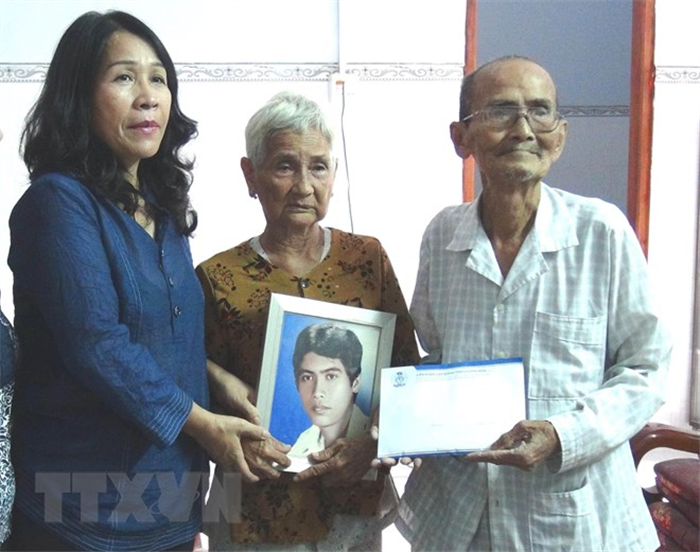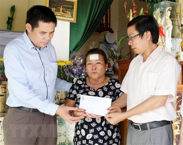 Đại diện Liên đoàn Lao động tỉnh Quảng Trị và Quỹ từ thiện xã hội Tấm lòng Vàng (Báo Lao động) trao tiền hỗ trợ cho bà Nguyễn Thị Hằng, trú tại thành phố Đông Hà, tỉnh Quảng Trị, là mẹ liệt sĩ Hoàng Ánh Đông hy sinh trong cuộc chiến đấu bảo vệ chủ quyền biển đảo Tổ quốc ở Gạc Ma năm 1988.
