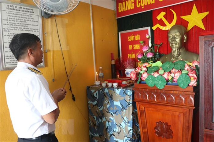 Các chiến sỹ Lữ đoàn hải quân 146 thắp hương tưởng niệm các liệt sỹ hải quân đã anh dũng hy sinh trong cuộc chiến đấu bảo vệ chủ quyền biển đảo Tổ quốc ở Gạc Ma, Cô Lin, Len Đao thuộc quần đảo Trường Sa của Việt Nam.