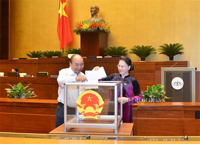 Chủ tịch Quốc hội Nguyễn Thị Kim Ngân và Thủ tướng Chính phủ Nguyễn Xuân Phúc bỏ phiếu phê chuẩn danh sách Phó Chủ tịch và Ủy viên Hội đồng bầu cử quốc gia; bầu Ủy viên UBTVQH (ngày 12/6/2020). |