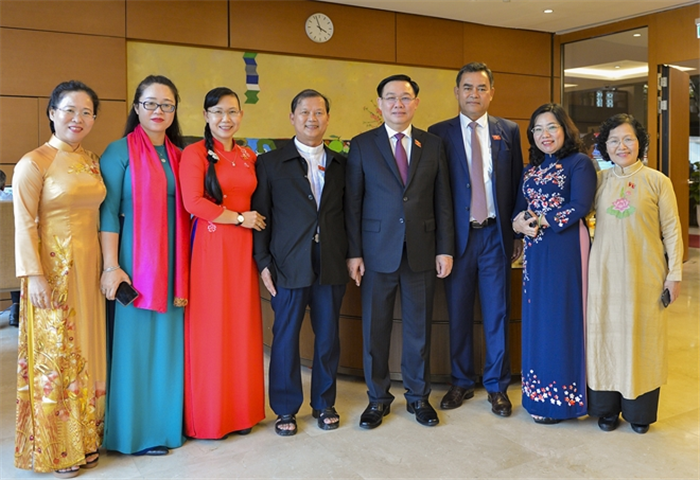 Đồng chí Vương Đình Huệ với các đại biểu bên lề kỳ họp. |
