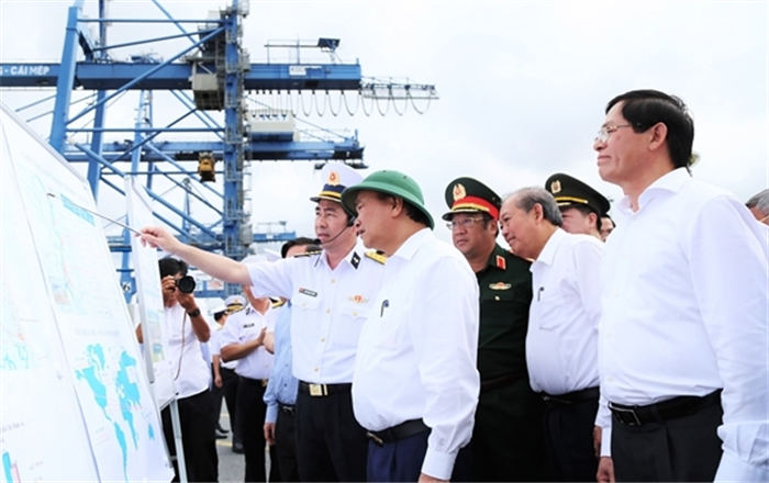 Thủ tướng Nguyễn Xuân Phúc nghe lãnh đạo Tổng công ty Tân cảng Sài Gòn báo cáo hoạt động tại cụm cảng Tân Cảng Cái Mép-Thị Vải. |