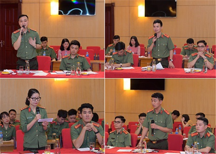 Đại diện đoàn viên các Chi đoàn thuộc Đoàn Thanh niên Văn phòng Bộ Công an đặt câu hỏi đối với các đại biểu. |