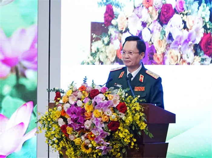 Trung tướng GS, TS, TTND Mai Hồng Bàng, Giám đốc Bệnh viện Trung ương Quân đội 108 phát biểu tại buổi lễ. |