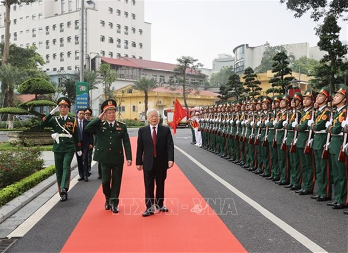 Tổng Bí thư Nguyễn Phú Trọng, Bí thư Quân ủy Trung ương duyệt đội danh dự QĐND Việt Nam. |