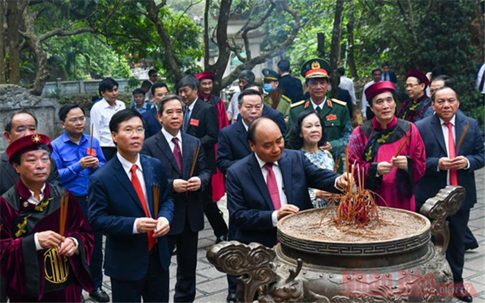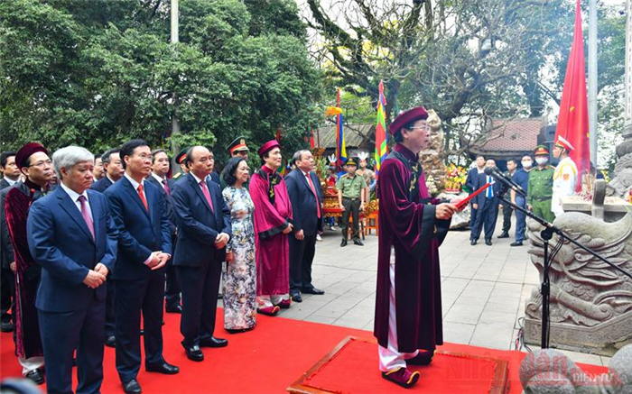 Với tấm lòng thành kính tri ân công đức Tổ tiên, thể hiện đạo lý “Uống nước nhớ nguồn” của dân tộc Việt Nam, Chủ tịch nước Nguyễn Xuân Phúc và các đồng chí lãnh đạo Đảng, Nhà nước vào Thượng cung dâng hương, hoa bày tỏ lòng biết ơn sâu sắc các bậc tiền nhân đã có công dựng nước và giữ nước.