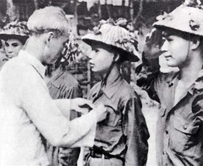 Chủ tịch Hồ Chí Minh thưởng huy hiệu cho các chiến sĩ lập nhiều chiến công trong chiến dịch Điện Biên Phủ. |