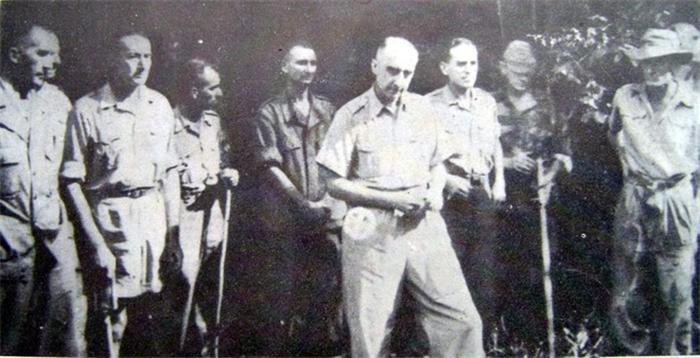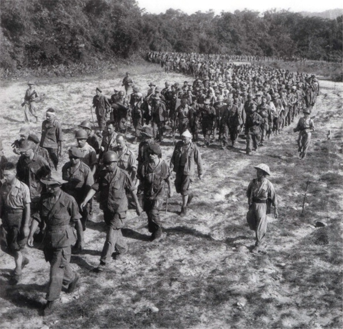 Những binh sĩ Pháp đầu hàng được áp giải đến nơi tạm giam sau thất bại tại chiến trường Điện Biên Phủ. |