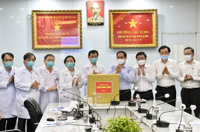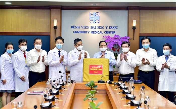Thủ tướng Phạm Minh Chính tặng quà động viên tập thể cán bộ, nhân viên, y, bác sĩ BV Đại học Y Dược TP HCM. |