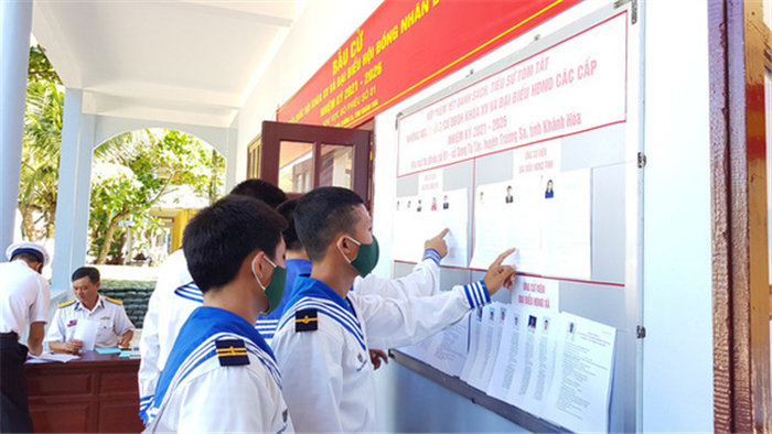 Sáng 16/5, quân và dân ở 20 tổ bầu cử: thị trấn Trường Sa và 2 xã đảo: Sinh Tồn, Song Tử Tây thuộc khối đảo của huyện Trường Sa (tỉnh Khánh Hòa) rộn ràng đi bỏ phiếu bầu cử đại biểu Quốc hội khóa XV và Hội đồng nhân dân các cấp nhiệm kỳ 2021-2026, sớm hơn một tuần so với đất liền.