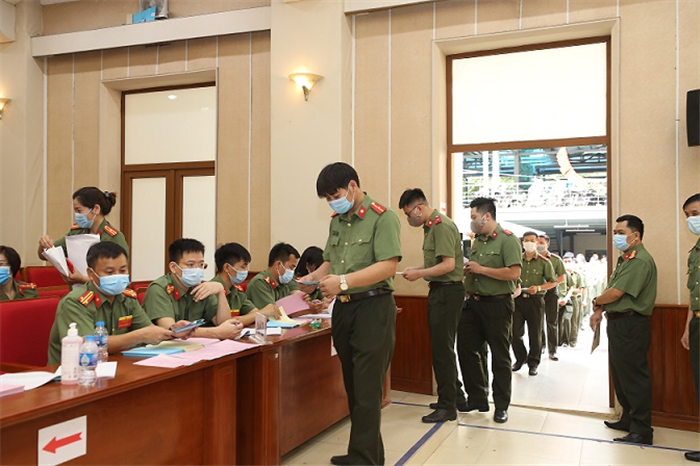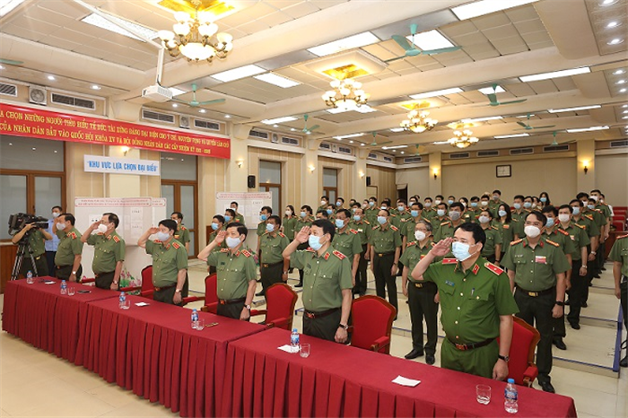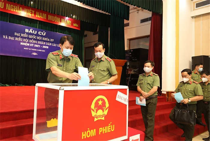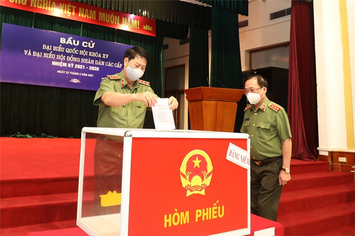 Cùng thời điểm 6h45’ sáng 23/5/2021, tại Khu vực bỏ phiếu số 07 phường Trần Hưng Đạo, quận Hoàn Kiếm, thành phố Hà Nội (địa điểm số 15 Trần Bình Trọng), các tướng lĩnh, cán bộ, chiến sỹ Bộ Công an bỏ phiếu theo khu vực cơ quan Bộ đã dự Lễ khai mạc khu vực bầu cử.