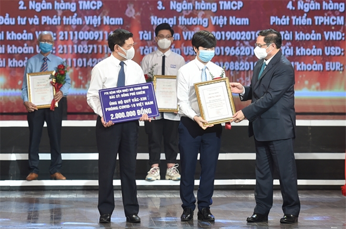 Thủ tướng xúc động nói, Quỹ vaccine là quỹ của sự nhân ái, của tinh thần đoàn kết, của niềm tin, của trái tim kết nối trái tim để chúng ta cùng nhau vượt qua khó khăn, góp phần tạo nên một Việt Nam chiến thắng, để một lần nữa chúng ta lại ghi danh, viết nên lịch sử chiến thắng vẻ vang của dân tộc - chiến thắng đại dịch COVID-19.