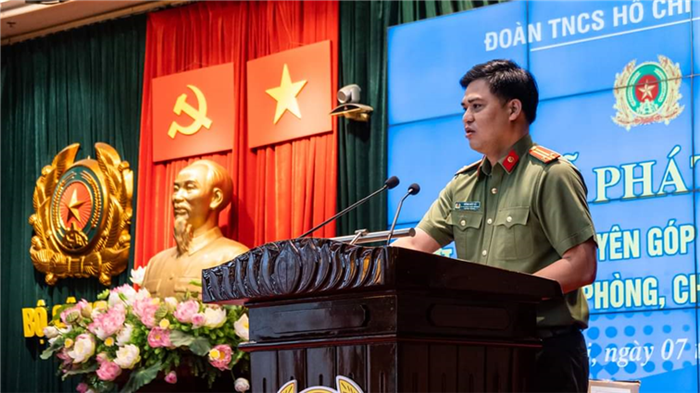 Trung tá Đồng Đức Vũ, Bí thư Đoàn Thanh niên Bộ Công an phát biểu tại buổi lễ.