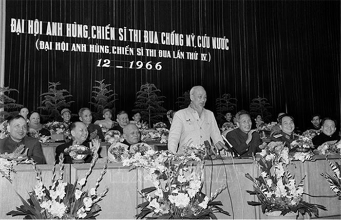 Chủ tịch Hồ Chí Minh nói chuyện tại Đại hội Anh hùng, Chiến sĩ thi đua chống Mỹ, cứu nước (Đại hội Anh hùng, Chiến sĩ thi đua lần thứ IV) diễn ra tại Hà Nội tháng 12-1966. Ảnh: Tư liệu TTXVN |
