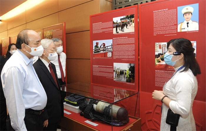 Tổng Bí thư Nguyễn Phú Trọng, Chủ tịch nước Nguyễn Xuân Phúc tham quan những hình ảnh, hiện vật của các tấm gương bình dị mà cao quý của CBCS lực lượng CAND. |