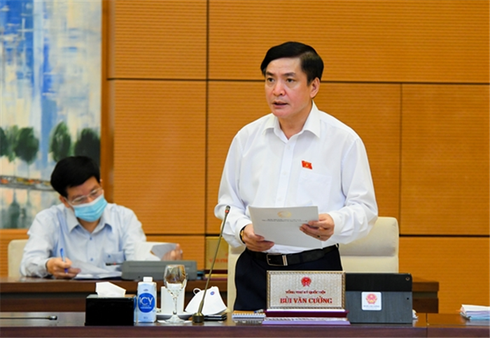 Tổng Thư ký Quốc hội, Chủ nhiệm Văn phòng Quốc hội, Chánh Văn phòng Hội đồng bầu cử quốc gia Bùi Văn Cường báo cáo trước UBTVQH. Ảnh: VPQH |