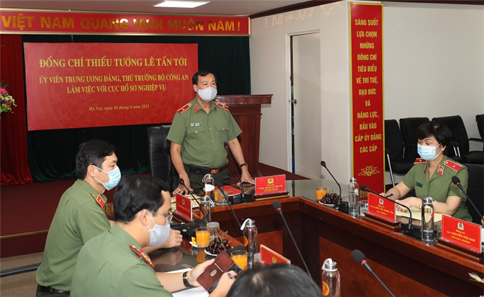 Phát biểu tại buổi làm việc, Thứ trưởng Lê Tấn Tới ghi nhận và biểu dương những kết quả, thành tích mà Cục Hồ sơ nghiệp vụ đã đạt được trong 6 tháng đầu năm 2021. Khẳng định vị trí, vai trò đặc biệt quan trọng của công tác hồ sơ nghiệp vụ trong công tác công an, đồng chí Thứ trưởng nhấn mạnh, trong bất cứ giai đoạn lịch sử nào, công tác hồ sơ nghiệp vụ cũng giữ vị trí, vai trò đặc biệt quan trọng trong công tác bảo vệ chế độ, bảo vệ Đảng. Vì vậy, để đáp ứng được nhiệm vụ đòi hỏi mỗi cán bộ làm công tác hồ sơ nghiệp vụ phải khách quan, công tâm, làm đúng chức năng, nhiệm vụ của mình…