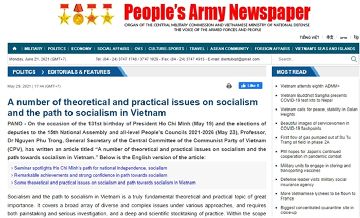 Bài viết của Tổng Bí thư Nguyễn Phú Trọng (phiên bản tiếng Anh) được đăng tải trên Báo Quân đội nhân dân Điện tử tiếng Anh. |