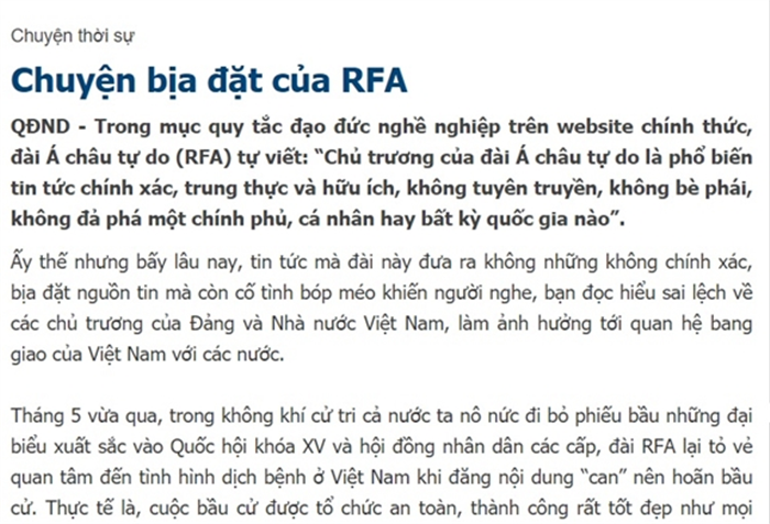 Bài "Chuyện bịa đặt của RFA" trên Báo Quân đội nhân dân. |