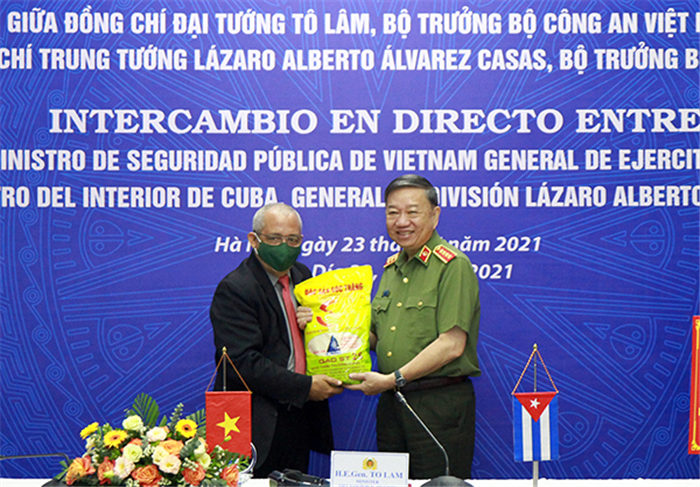 Cũng tại hội đàm, thông qua đồng chí Pedro Soca Pascual, thay mặt Bộ Công an Việt Nam, Bộ trưởng Tô Lâm trao 100 tấn gạo tặng Bộ Nội vụ Cuba để chia sẻ những khó khăn trong thời gian này.