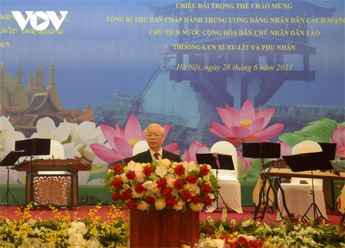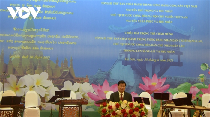 Tối nay, tại Trung tâm Hội nghị quốc tế, Hà Nội, Tổng Bí thư Nguyễn Phú Trọng chủ trì tiệc chiêu đãi trọng thể chào mừng Tổng Bí thư, Chủ tịch nước Thongloun Sisoulith và Đoàn đại biểu cấp cao Đảng, Nhà nước Lào đang có chuyến thăm chính thức nước ta. Cùng dự có Chủ tịch nước Nguyễn Xuân Phúc, Thủ tướng Phạm Minh Chính, Chủ tịch Quốc hội Vương Đình Huệ, các Ủy viên Bộ Chính trị, Bí thư Trung ương Đảng, lãnh đạo các Bộ ban ngành Trung ương và thành phố Hà Nội.